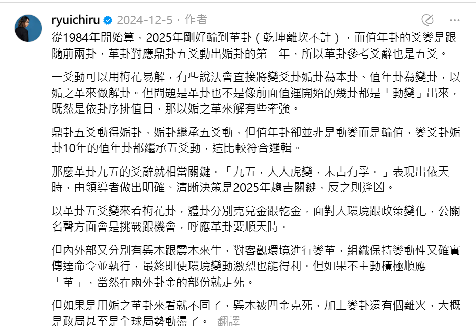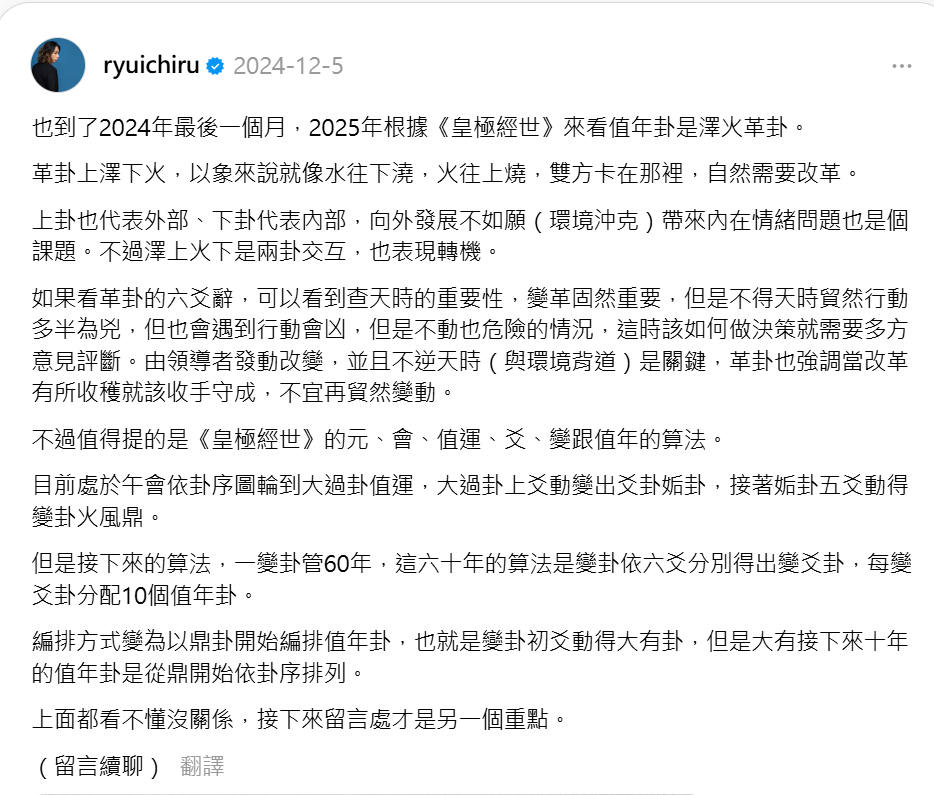 因此,在解讀 2025 年的值年卦「澤火革」時,您應將重點放在九五爻所描述的**「權威、果斷、順應民心」的變革精神,並觀察現實世界中「改命」**(制度、法律、組織的實質改變)的具體發生。
