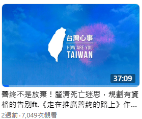 在〈[節目]台灣心事:《走在推廣善終的路上》作者畢柳鶯醫師〉中有 1 則留言
