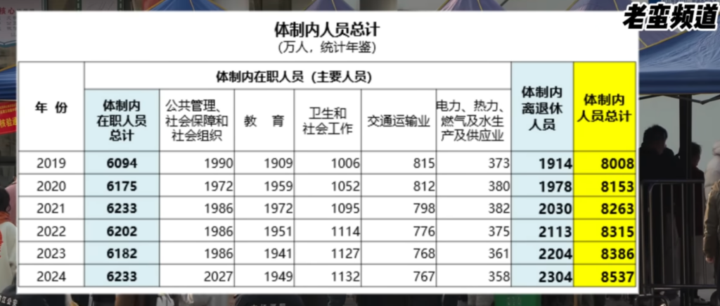 依老蠻統計,體制內在職正式職員約有6200萬,離退休人員約2300萬,共計約8500萬。