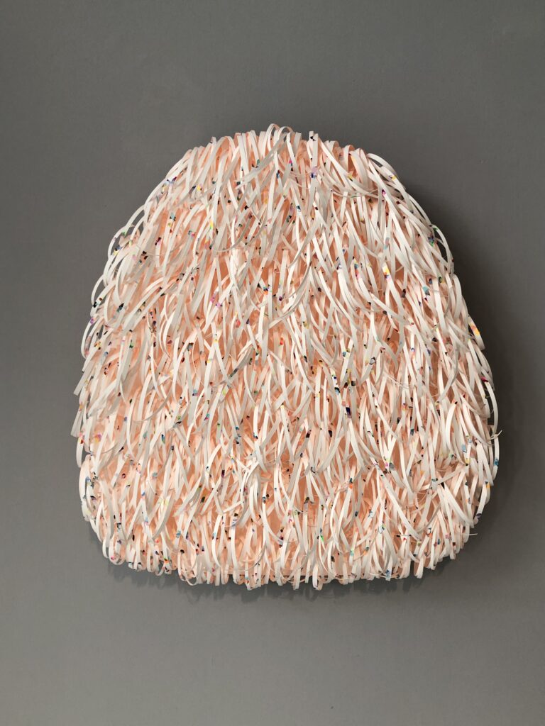 將不同顏色的壓克力顏料或墨水染繪於裁剪過的紙條上,並結合色彩與光線交融的手法,以及多層紙張堆疊的層次和素描般的筆觸,爲視覺觀看與接收過程創造出豐富的對話與變化。