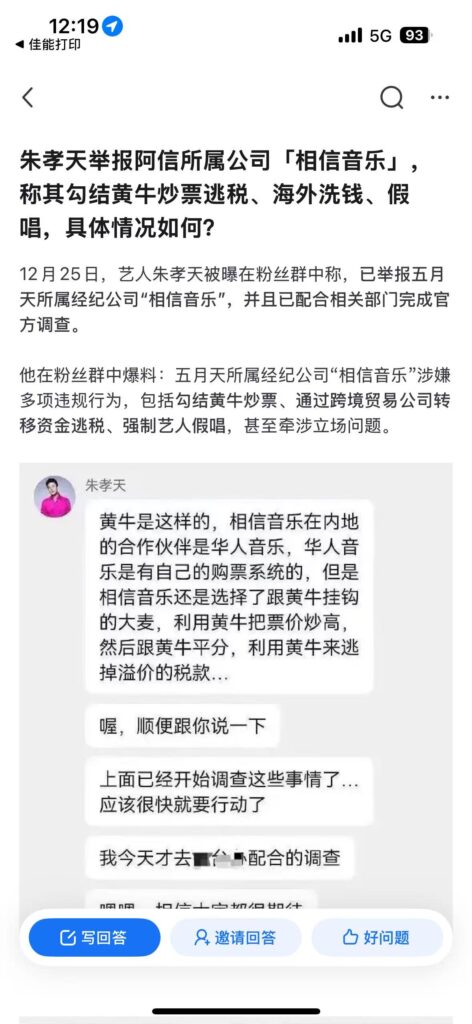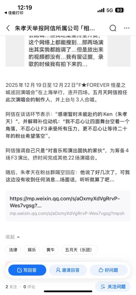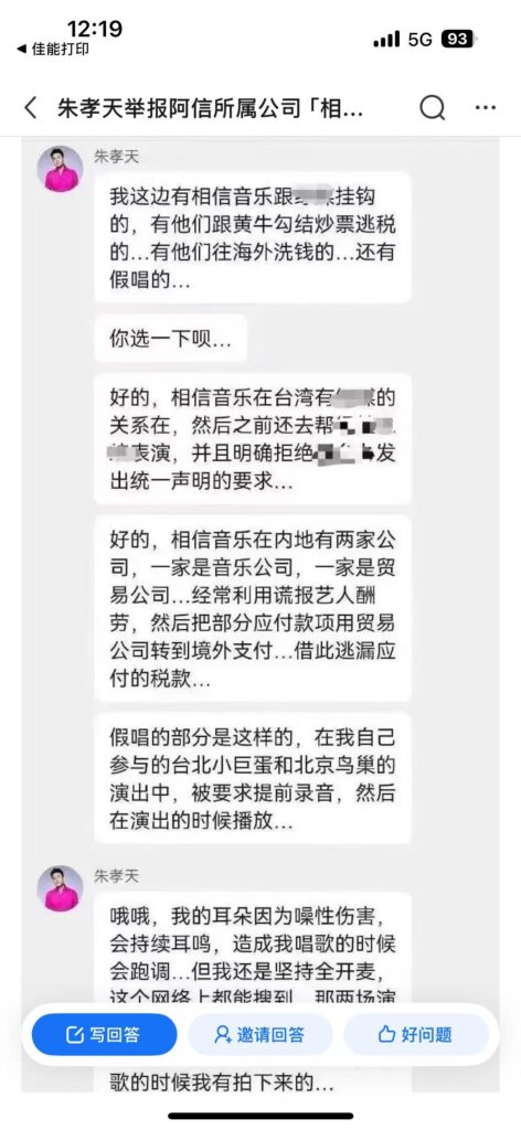相信音樂有無沒有違法情事我不知,不能合體的曲直內幕我不知,但朱的說法涉及舉(告)報(密),我想相信音樂不會掉以輕心,而且情緒複雜: