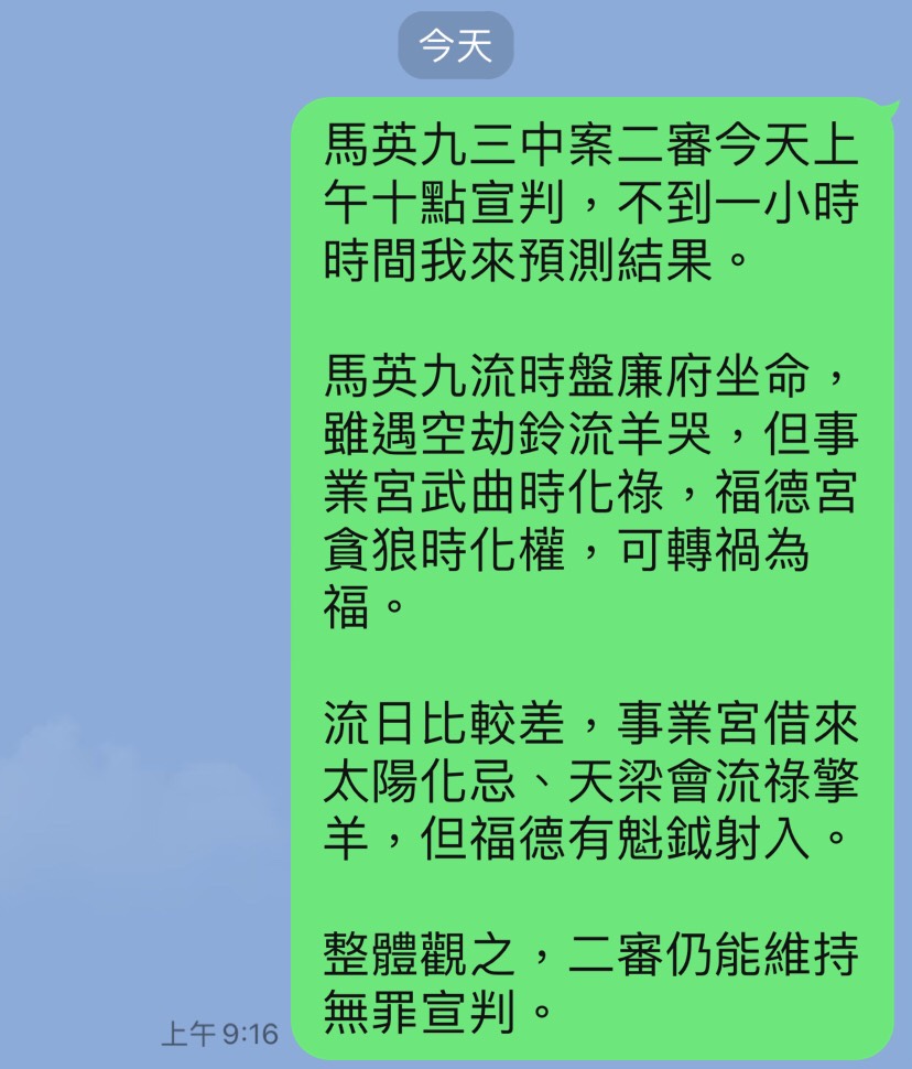 [驗證]三中案二審宣判,馬英九維持無罪,預測成功 2025 年 12 月 31 日命理研究三中案、馬英九Chen Lerong 2025年12月31日起床後看到新聞預測: 一審判決被告馬英九、張哲琛、汪海清等無罪,後經檢方上訴,台灣高等法院今(31)日判決「上訴駁回」,三人仍維持無罪判決。 預測成功。 (寫於2025年12月31日) 相關文章: 神祕學裡的神秘,是種「沒有主觀意識的狀態」(這篇很重要,讀我命理文的人請細思) 陸續發現一些回應留言背後透出的想法。... [驗證]艾爾段要幫澤連斯基和普丁開和平峰會? 2024年3月8日,土耳其總統艾爾段在伊斯坦堡與烏克蘭總統澤連斯基會談後舉行聯合記者會中表示:「我們將舉行和平 … 閱讀全文 [驗證]艾爾段要幫澤連斯基和普丁開和平峰會? →...