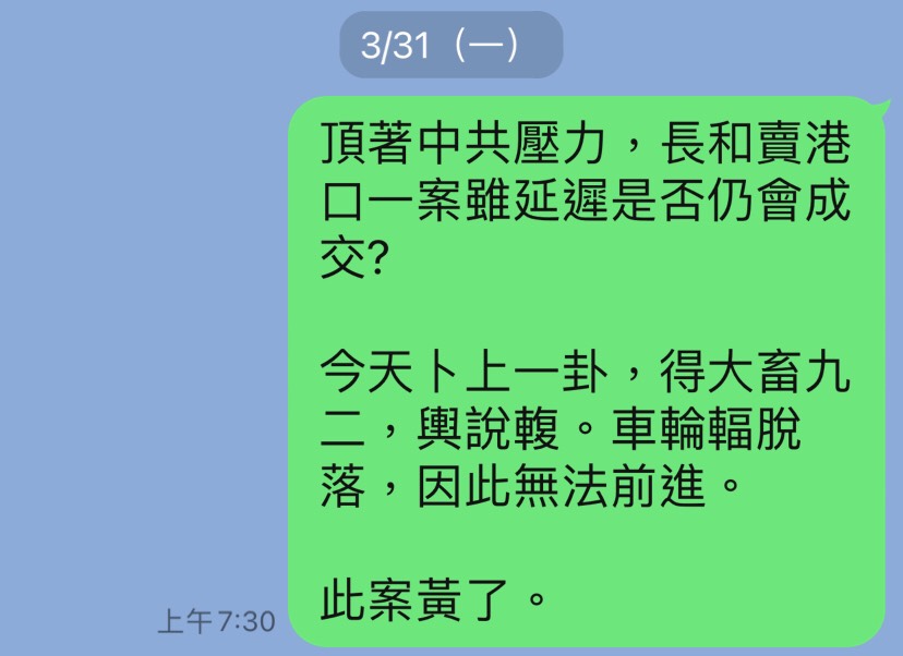 7月28日長和公布,就擬出售港口業務一事的獨家磋商期屆滿,目前仍在討論,並擬邀請中國大陸主要策略投資者加入成為財團重要成員,只有在獲得中國監管機構和部門批准才會進行交易。