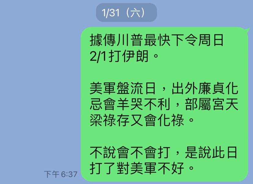 [驗證]2/1美軍打伊朗不利,預測成功 2026 年 2 月 3 日命理研究伊朗Chen Lerong 2026年1月31日預言: 結果2月1日沒打,2日伊朗與美國官員透露,雙方本月6日將在土耳其恢復核子談判。 沒打也不利於打。預測成功。 (寫於2026年2月3日) 相關文章: [提醒]農曆三月以色列殺氣更盛,也必付出相當代價 2024年4月5日新聞:... 不必擔心中東全面大戰 如有人擔心中東引發全面大戰,看看以下消息,我的感想是這場戲「各取所需」:... 伊朗2024甲辰年換大運 大家都說伊朗是哈瑪斯、真主黨等組織背後的大哥。我們看看大哥怎麼了。... 以哈戰爭一週年的前景 美國資深中東新聞記者David Ignatius在《華盛頓郵報》撰文談以哈戰爭一週年的前景:...
