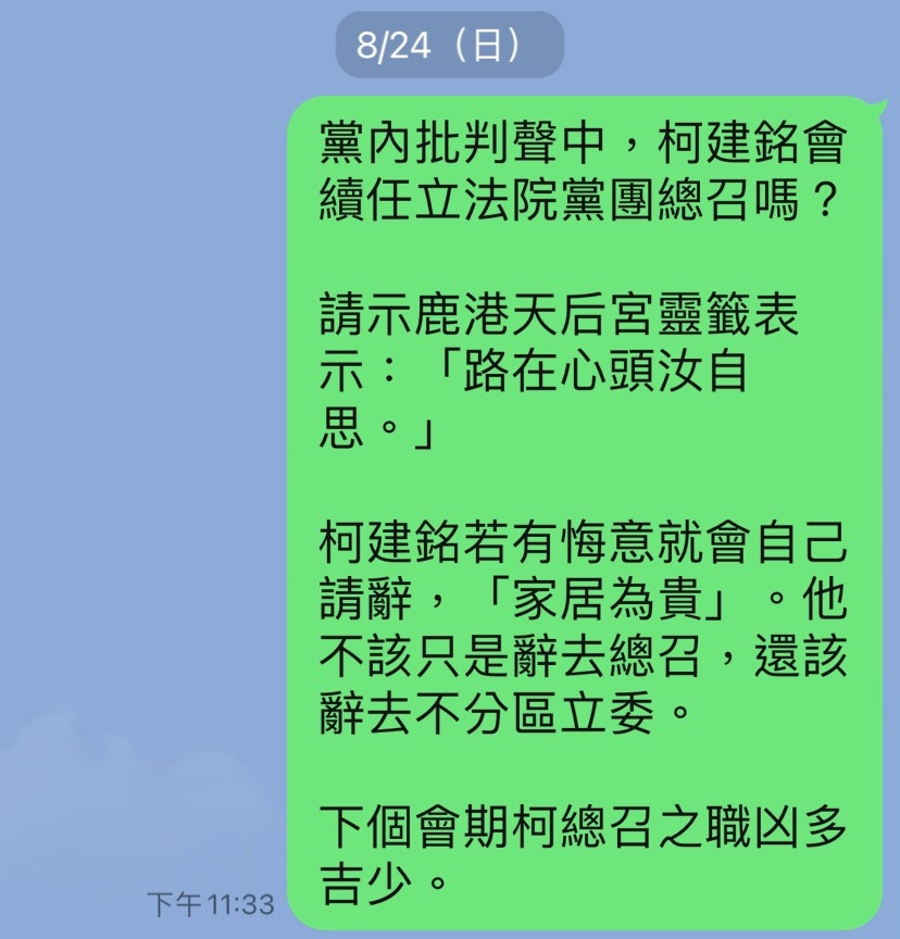 其實,去年8月24日已為柯建銘是否該堅持續任總召求籤: