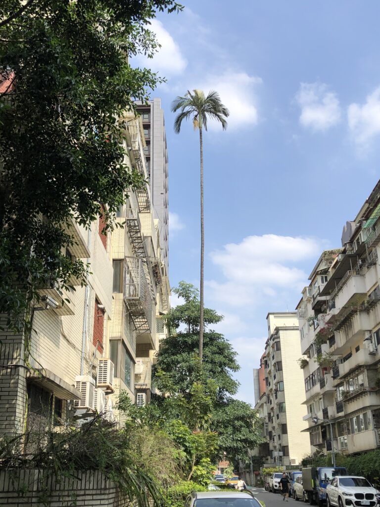 問AI,它說:「這棵高聳的樹從外觀特徵來看,應該是亞歷山大椰子(Archontophoenix alexandrae),屬於棕櫚科的一員。」「這棵樹在都市巷弄中長到超越五層樓高確實相當驚人,展現了極強的生命力。」