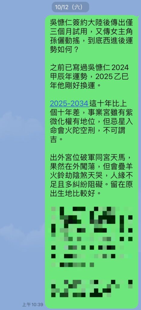 早在吳慷仁傳簽約大陸公司,2024年10月12日私下預言: