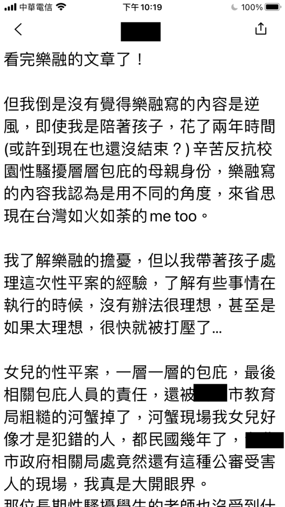 老友看了我的文章後以切身之痛寫下的文字,經她同意以馬賽克後分享: