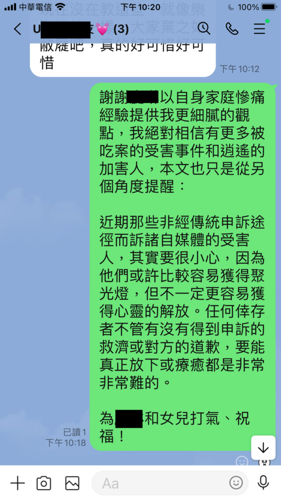 極少數公開爆料者,往往連懇切的道歉都得不到,也很難寄望從司法或體制得到救濟。他們寫臉書曝光案情後,內在能不能真的「翻篇」,是我最近探討的重點。