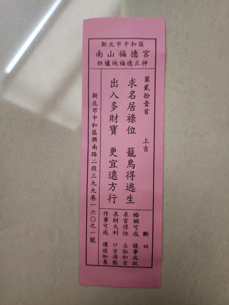 團友D剛去拜拜,抽到一支好籤樂得很: