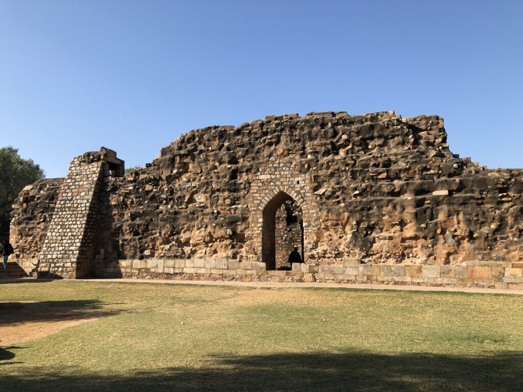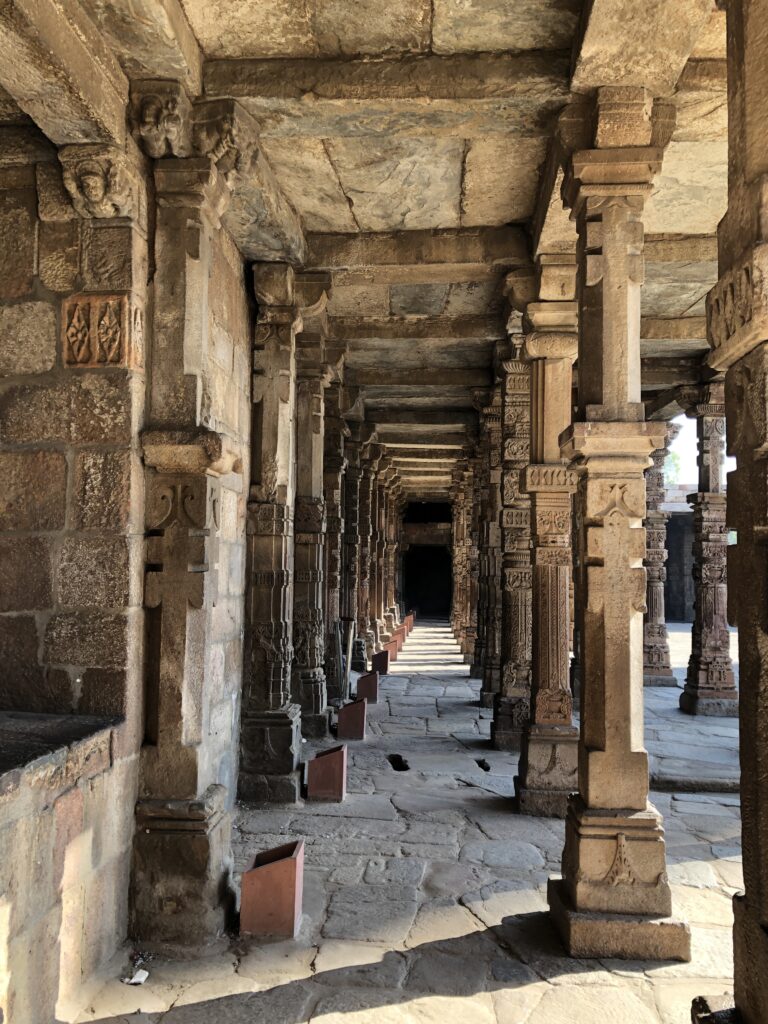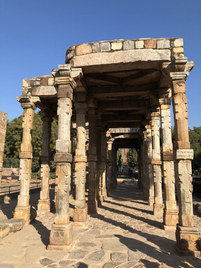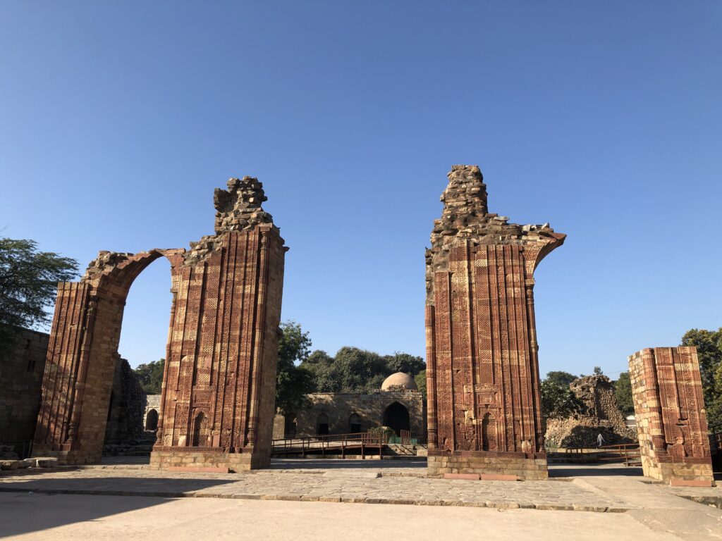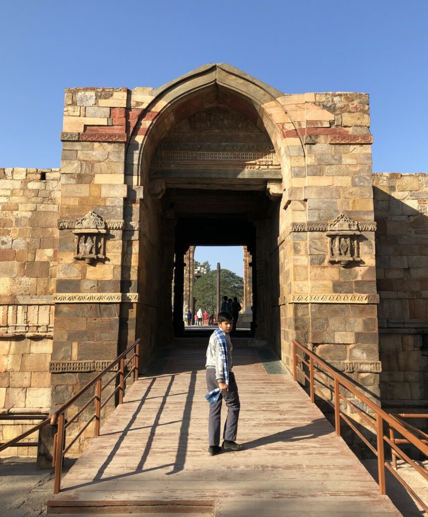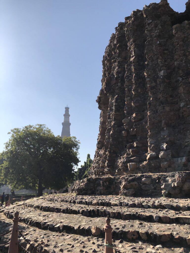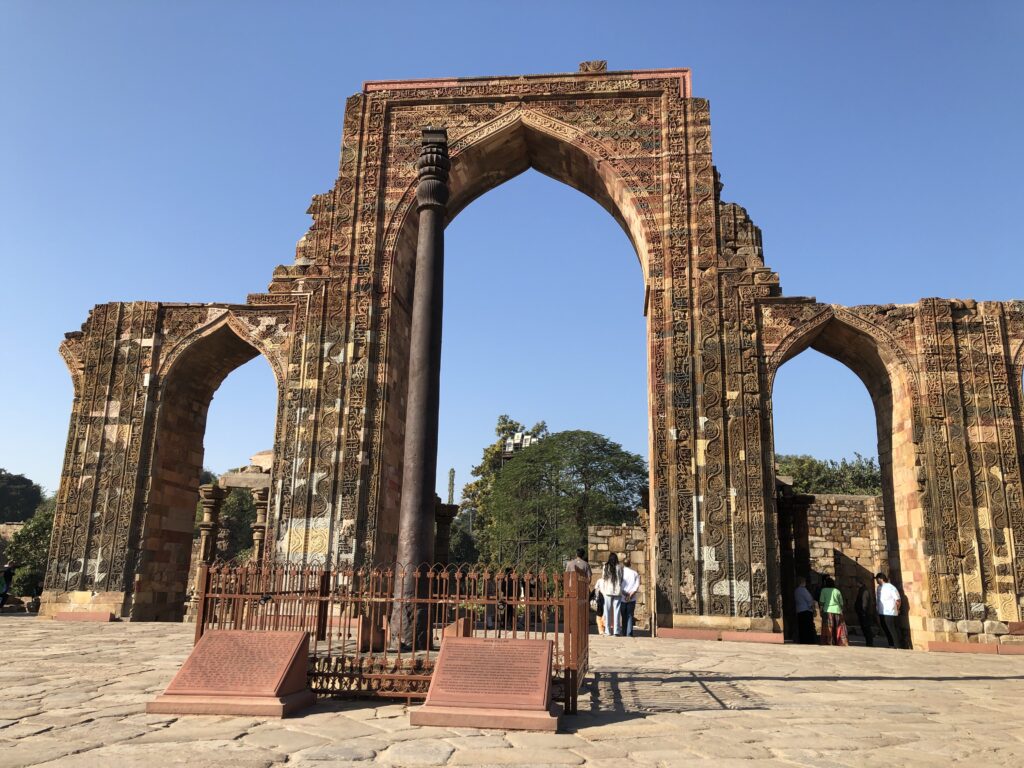 鐵柱背後是目前在印度保存下來最古老的清真寺Quwwat-ul-Islam (1193年始建)。部分建材從拆毀的印度廟而來,所以呈現伊斯蘭與印度混合風格。