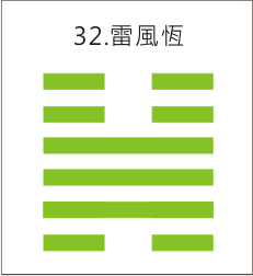 恒,亨,無咎,利貞,利有攸往。象徵夫婦內外分工、家庭穩定和諧。易學網Jack稱:「凡事可以守成,可長可久,細水長流,但比較不利於創新求變。」