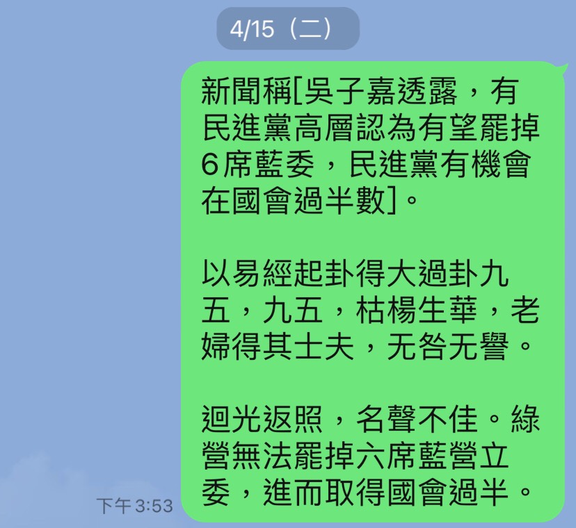 早以斗數、占星論過大罷免整體運勢,2025年4月15日再易經占卜,直接問有無可能罷掉六席藍委: