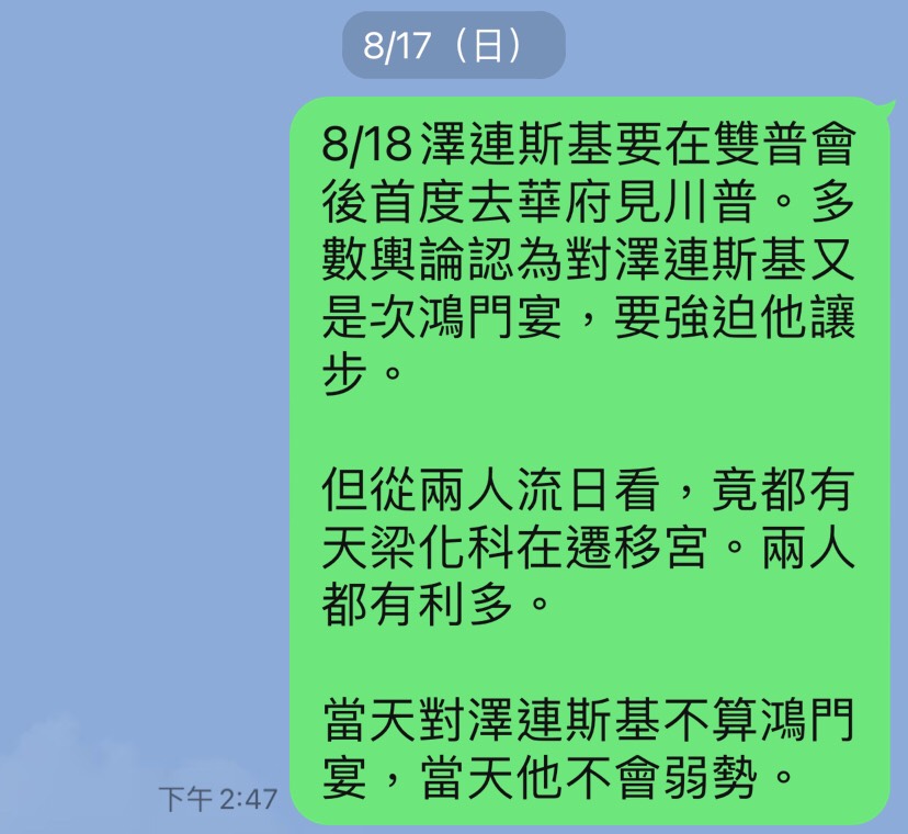 川普沒強逼澤連斯基,澤連斯基一定也有為有守沒有無條件「跪美」。8月18日不是鴻門宴,天梁化科果然發威。