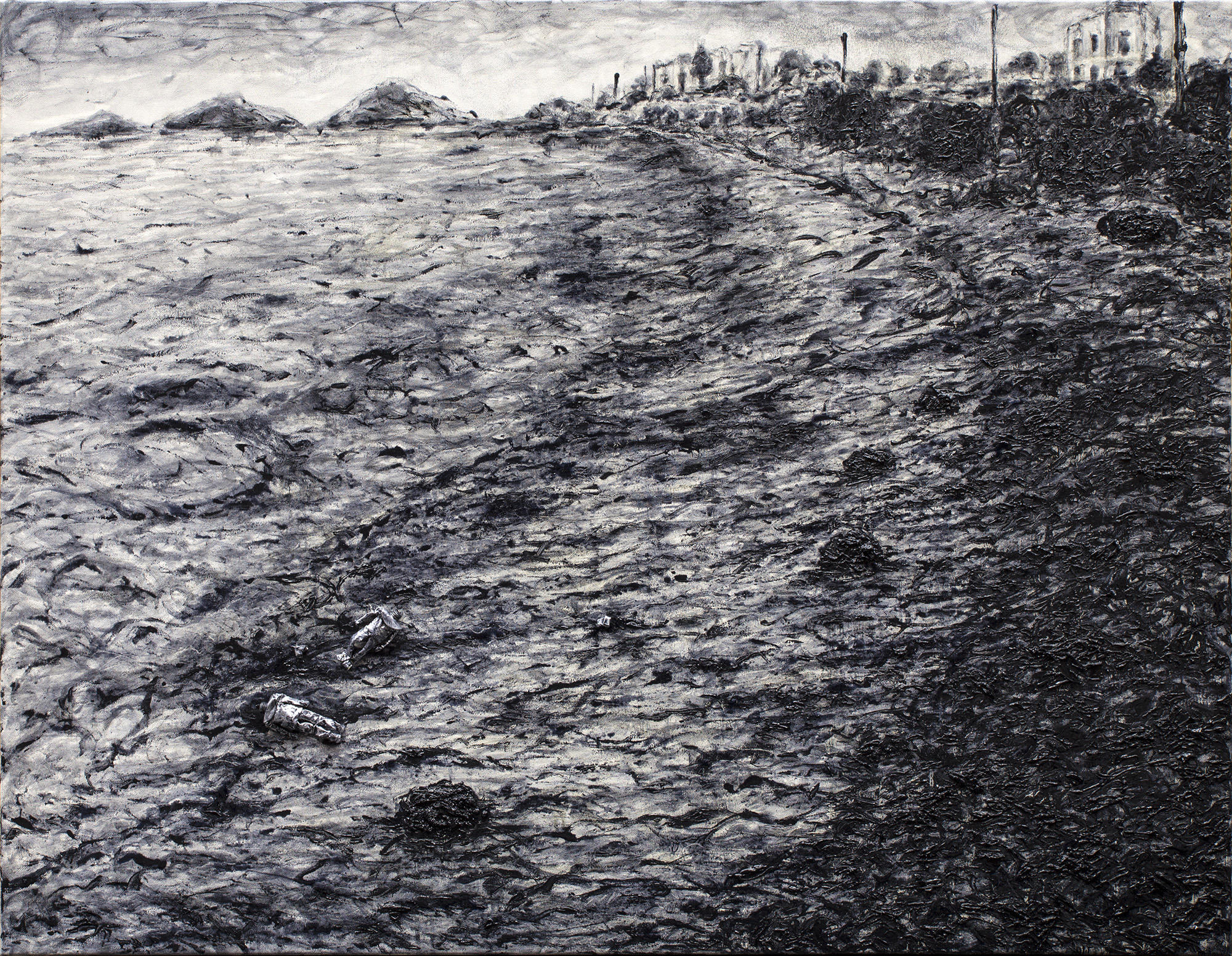 父親收藏的石塊紋理,在父喪後被他放大入畫;自身體內的血滴,也在多年後的圖紙上產生化學作用。而用罄的原子筆、鉛筆、鉛筆屑、乃至用完的顏料錫管,這些幫助他創作的工具,也在死後仍發揮貢獻——比如,你看得出《博德鲁姆海灘》這幅以2015年敘利亞籍庫德族難民船難為背景的油畫,就是以顏料管具象漂浮海上的童屍?