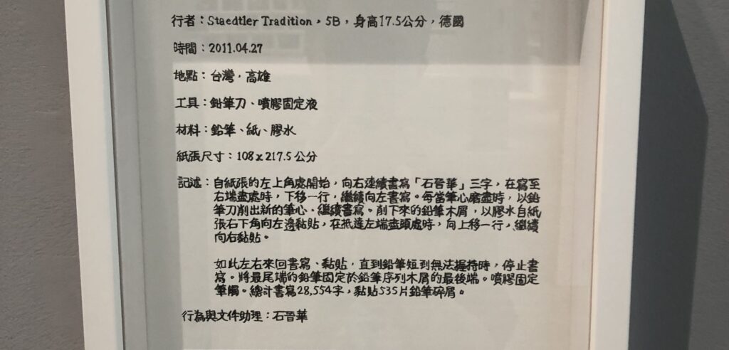 但和一般視覺藝術不同,單看石晉華最後的視覺成品,並無法完整掌握他的觀念。這是所謂觀念行為藝術的硬核,必須搭配文件說明製作過程,你才知道哪個材質、哪種執行,刻鏤著藝術家如何的運心。