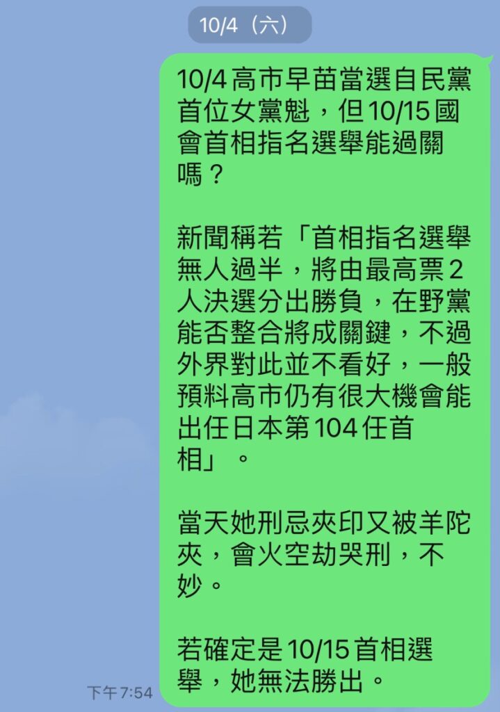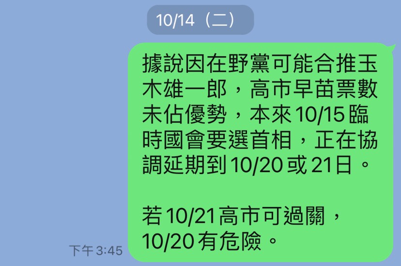 但高市早苗當選黨魁同日,我預言原訂10月15日首相指名選舉,她無法當首相: